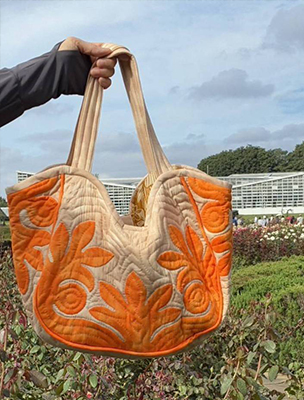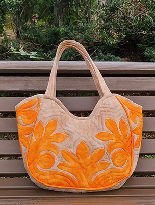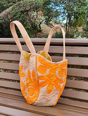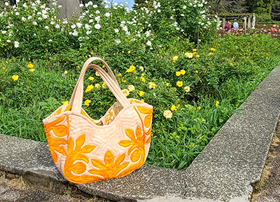 緑やお花の背景にハワイアンキルトバッグがとても映えますね~。